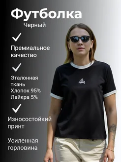 футболка хлопковая черная с принтом и контрастной отделкой