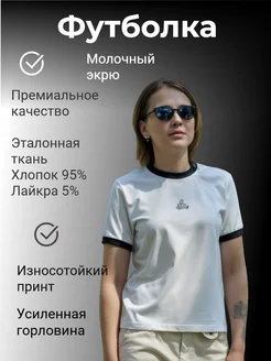 футболка хлопковая молочная с принтом и контрастной отделкой