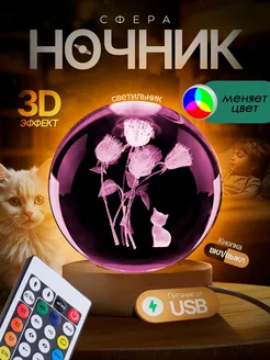 Ночник Хрустальный шар Цветы и Котенок, от USB, шар 8см