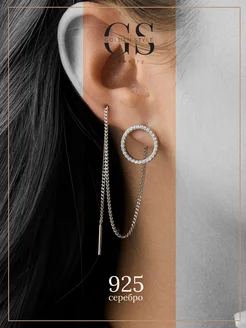Серьги серебро 925 моносерьга каффа с цепочкой