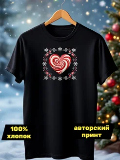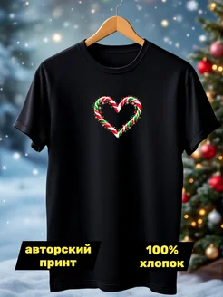 Футболка черная новогодняя Сердце Леденец 2026 хлопок