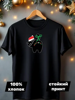 Футболка черная новогодняя Кот НГ забавный хлопок