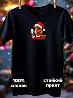 Футболка черная новогодняя с принтом Лошадь 2026 хлопок