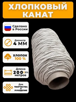 Хлопковый канат 4 мм 200 метров для рукоделия и творчества