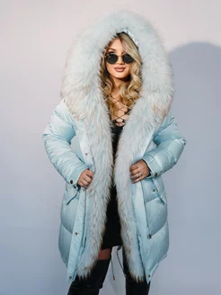 Длинный зимний пуховик с натуральным мехом песца и капюшоном