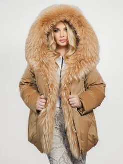 Зимний пуховик с натуральным мехом енота и капюшоном