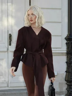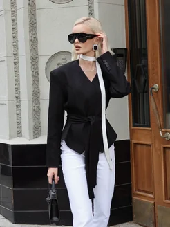 Приталенный пиджак черный короткий с поясом