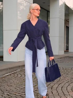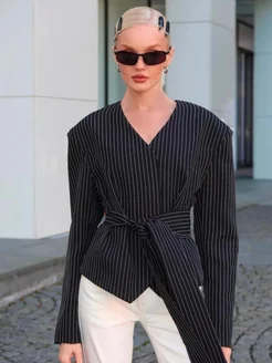 Приталенный пиджак короткий с поясом в полоску