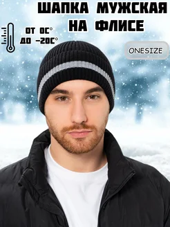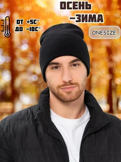 Шапка осенняя двойная черная бини с отворотом вязаная