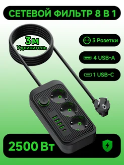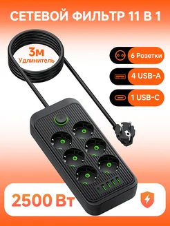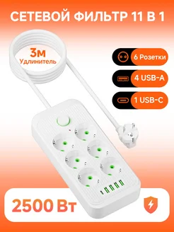 2500 Вт Сетевой фильтр 3 метра Удлинитель с USB и Type-c