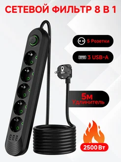 2500 Вт Сетевой фильтр 5 метра Удлинитель с USB и Type-c