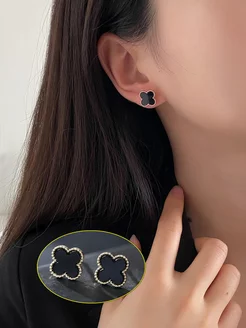 Пусеты мини четырехлистник черный на серебристом