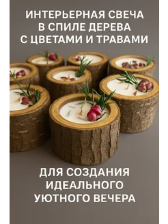 Интерьерная свеча в спиле дерева с цветами и травами
