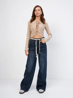 Джинсы женские на резинке осенние свободного кроя с шнурками