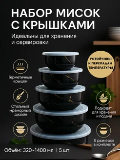 Набор мисок с крышками, 5 шт, керамические, черный мрамор