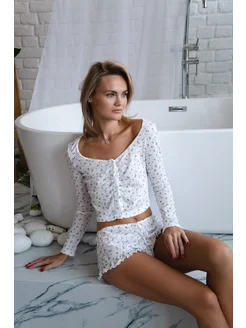 Пижамный комплект лонгслив и шорты с рюшами в цветочек