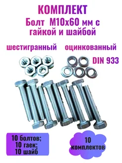 Комплект Болт М10х60 мм с Гайкой и Шайбой, 10 шт