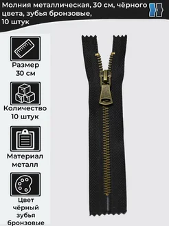 Молния металл, 30 см, чёрная, зубья бронзовые