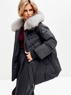 Пуховик короткий с натуральным мехом песца с поясом