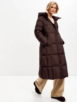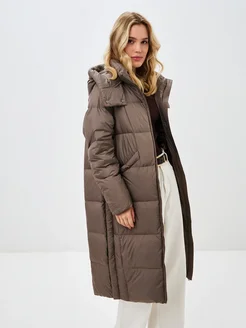Пуховик длинный стеганый с поясом на натуральном пухе