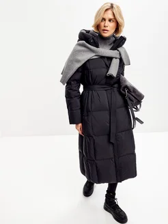 Пуховик зимний длинный стеганый с поясом на натуральном пухе