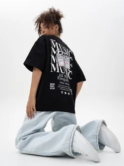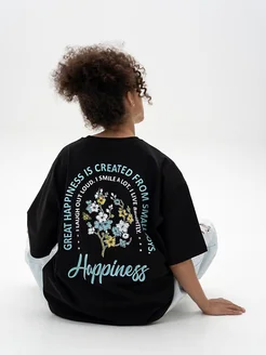 Черная футболка оверсайз с принтом на спине HAPPINESS