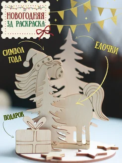 Деревянная 3Д раскраска новогодняя елка, конь и подарок