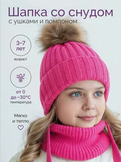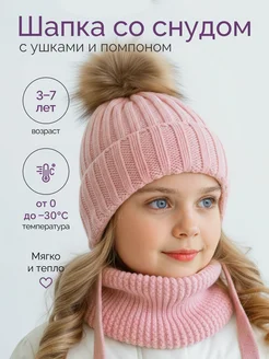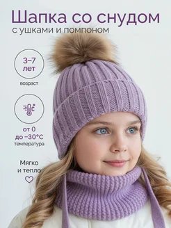 Шапка для девочки зимняя вязаная с помпоном и снуд