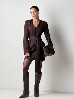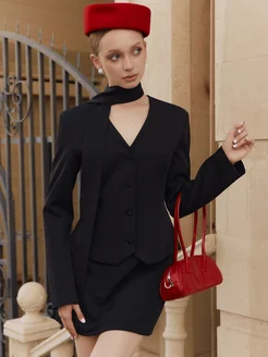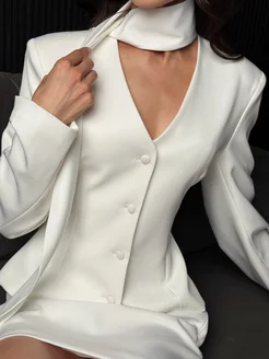 Приталенный пиджак с юбкой мини нарядный с шарфом
