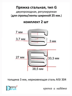 Пряжка двухпроходная с крючком, тип G, сталь (2 шт), 25 мм