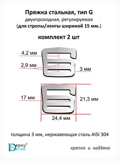 Пряжка двухпроходная с крючком, сталь, тип G (2 шт), 15 мм