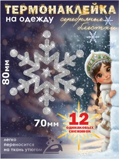 Термонаклейки блестящие Снежинки на одежду 8см 12шт серебро
