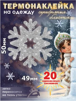 Термонаклейка блестящие Снежинки на одежду 5 см 20 шт сереб
