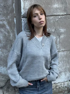 Вязаный свитер с v-образным вырезом оверсайз теплый