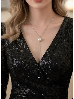 Колье на шею жемчуг кулон-лариат серебристая нить