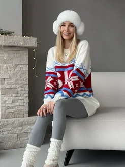Свитер вязаный оверсайз с принтом SKI белый зимний