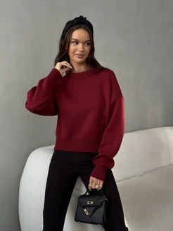 Свитер бордовый оверсайз вязаный укороченный теплый