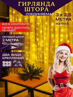 Новогодняя гирлянда штора на окно 3х2,5 желтая соединяемая