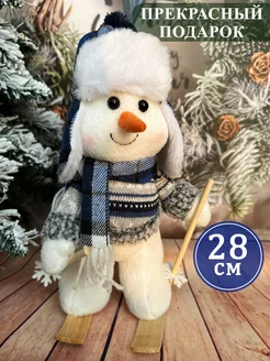 Новогодний снеговик на лыжах в шапке-ушанке со шарфом