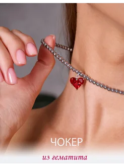 Чокер из гематита с подвеской красное сердце