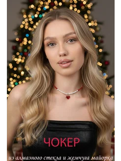 Чокер красный на шею из алмазного стекла и майорки с сердцем