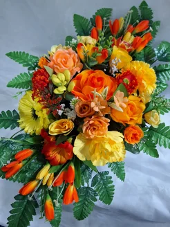 Корзина ритуальная на кладбище "Бархатные розы и подсолнухи"