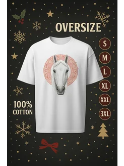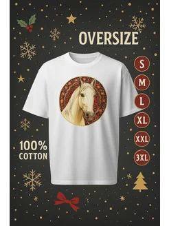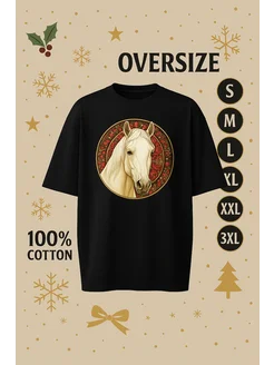 Футболка новогодняя оверсайз русский стиль с принтом лошади