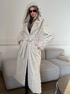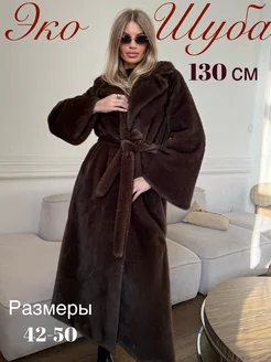 Эко шуба искусственная с капюшоном коричневая елочка 120см