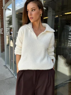 Свитер оверсайз удлиненный с воротником поло пушистый