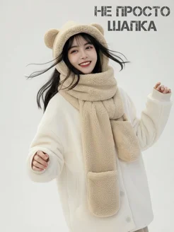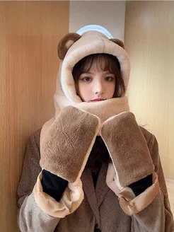 Шарф шапка мишка с ушками и варежками плюшевая меховая 3 в 1