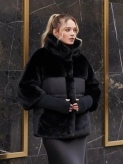 Шуба зимняя короткая с эко-норкой и капюшоном