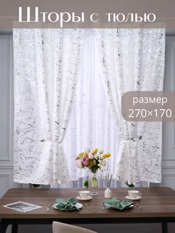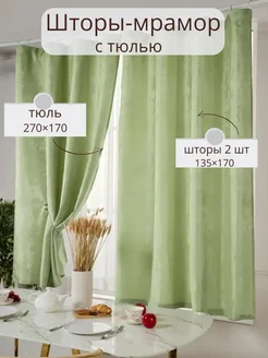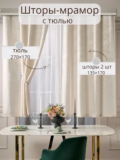 Комплект шторы мрамор с тюлем короткие для кухни