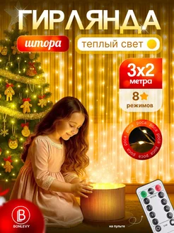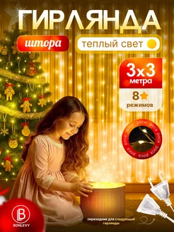 Гирлянда штора роса 3 на 3 метра теплый свет + крючки