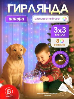 Гирлянда штора роса 3 на 3 метра разноцветная + крючки